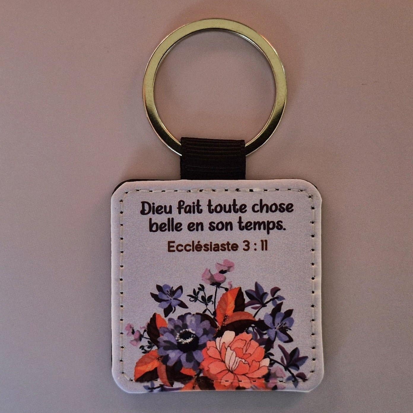 Porte-clés carré imprimé fleurs, fond bleu lavande, cuir synthétique.