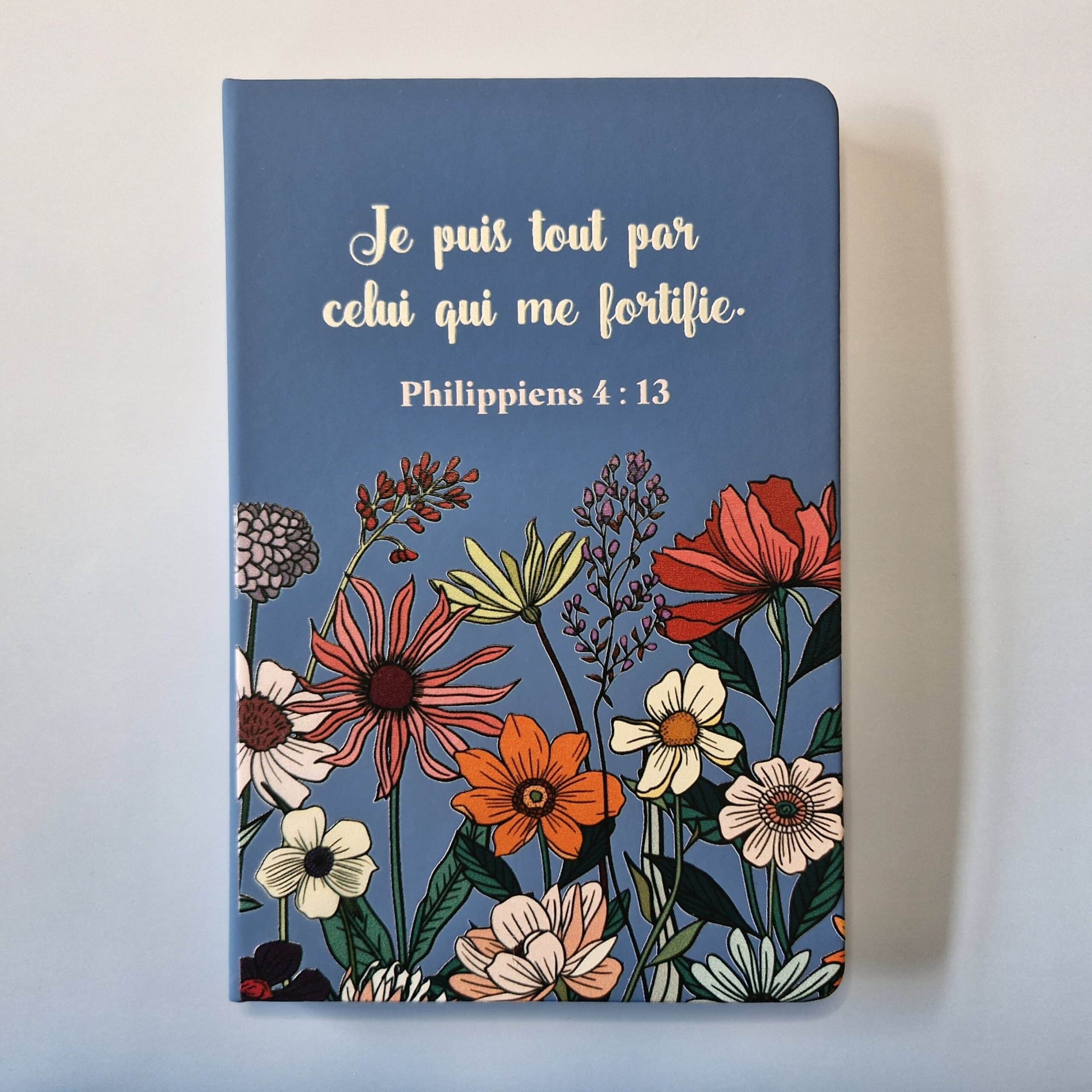Motif imprimé en relief fleurs avec le verset : « Je puis tout par celui qui me fortifie. » Philippiens 4 : 13