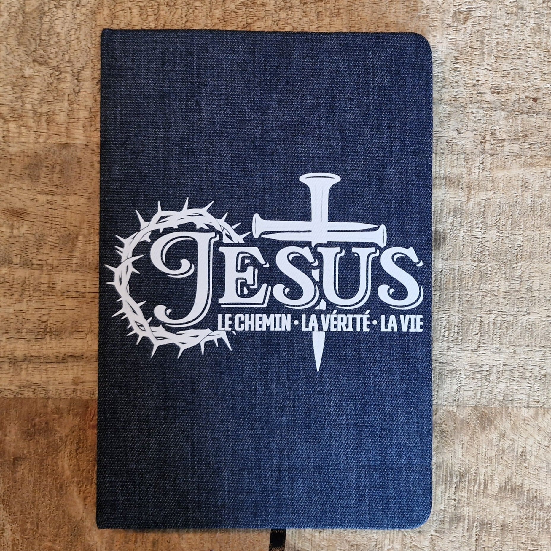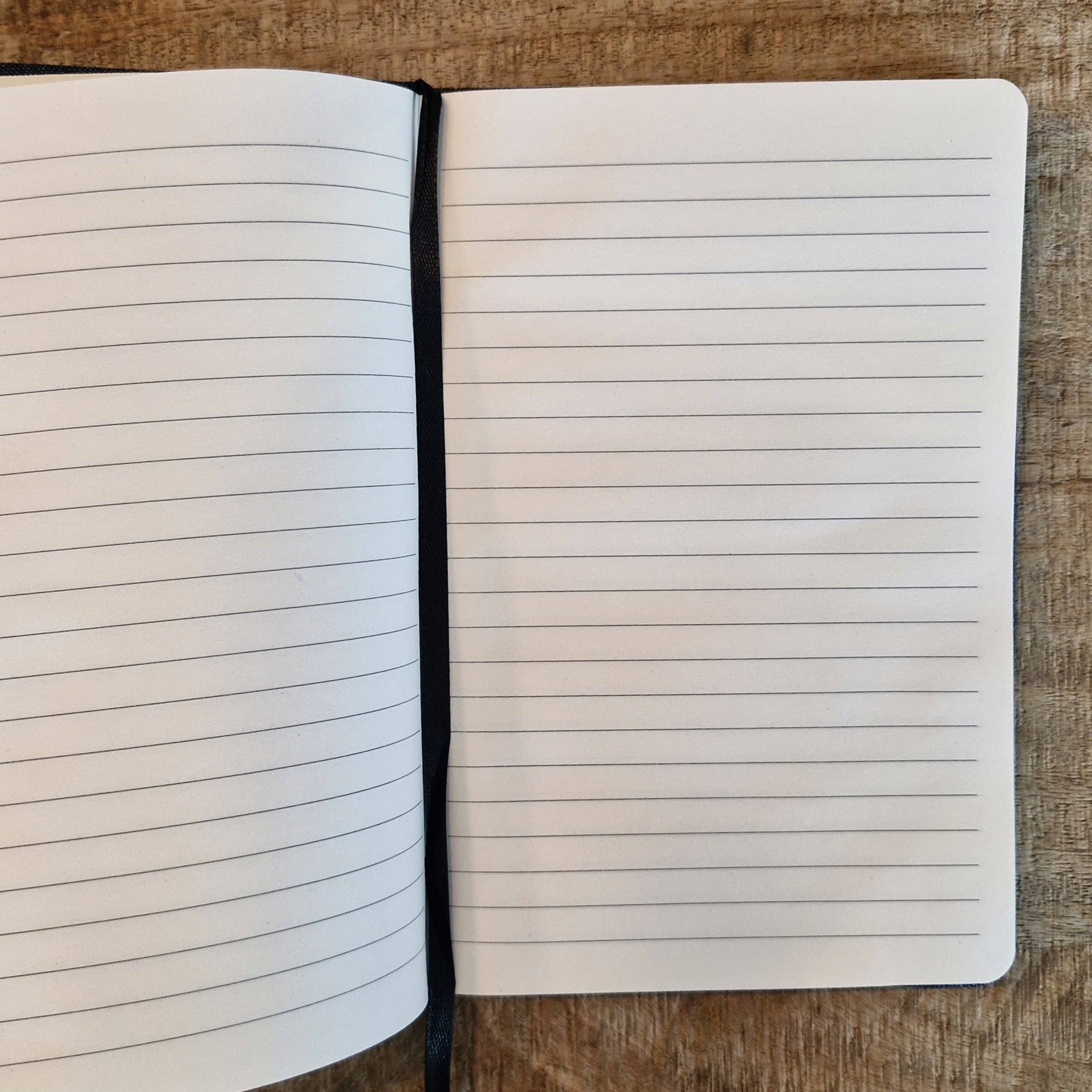 Carnet A5 à couverture rigide en toile denim (jean). Il contient 160 pages lignées papier ivoire.