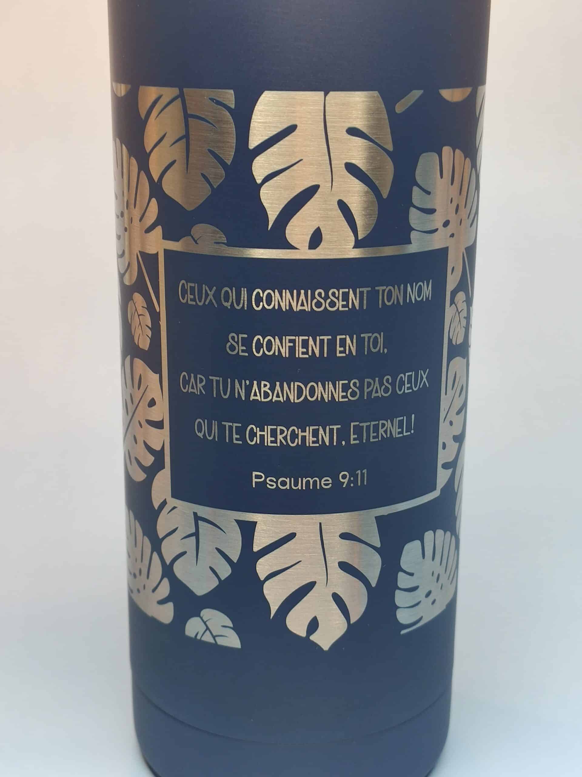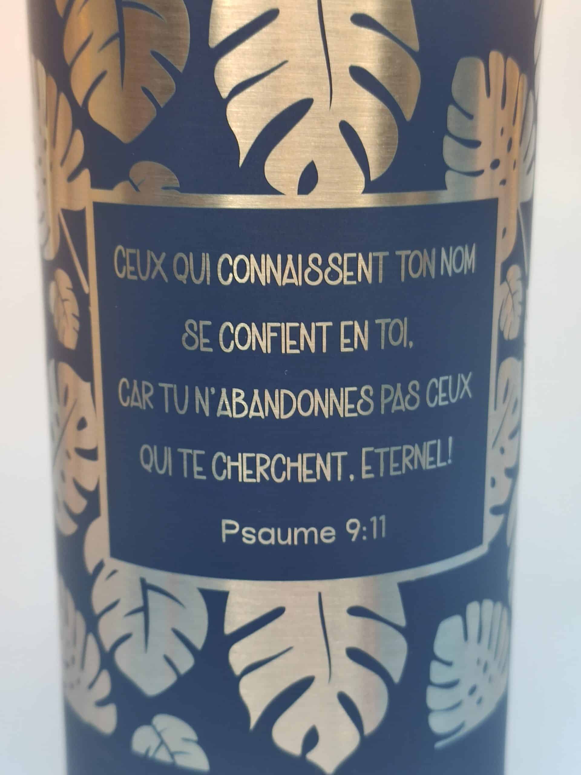 Décor feuillage gravé au laser. Le verset est aussi gravé au laser : « Ceux qui connaissent ton nom se confient en toi, car tu n’abandonnes pas ceux qui te cherchent, Éternel ! » Psaume 9 : 11