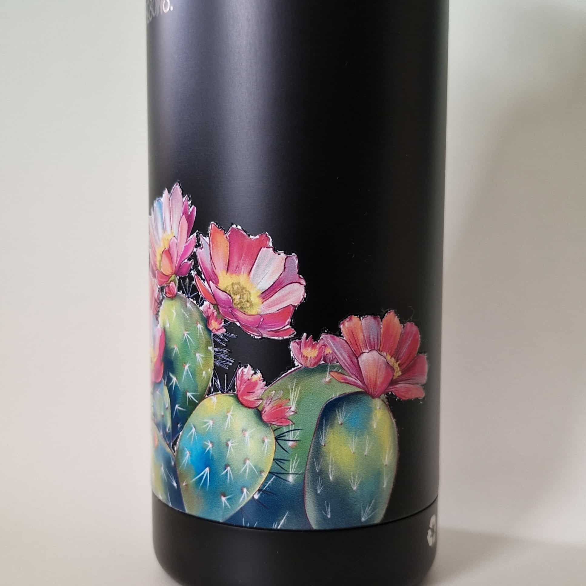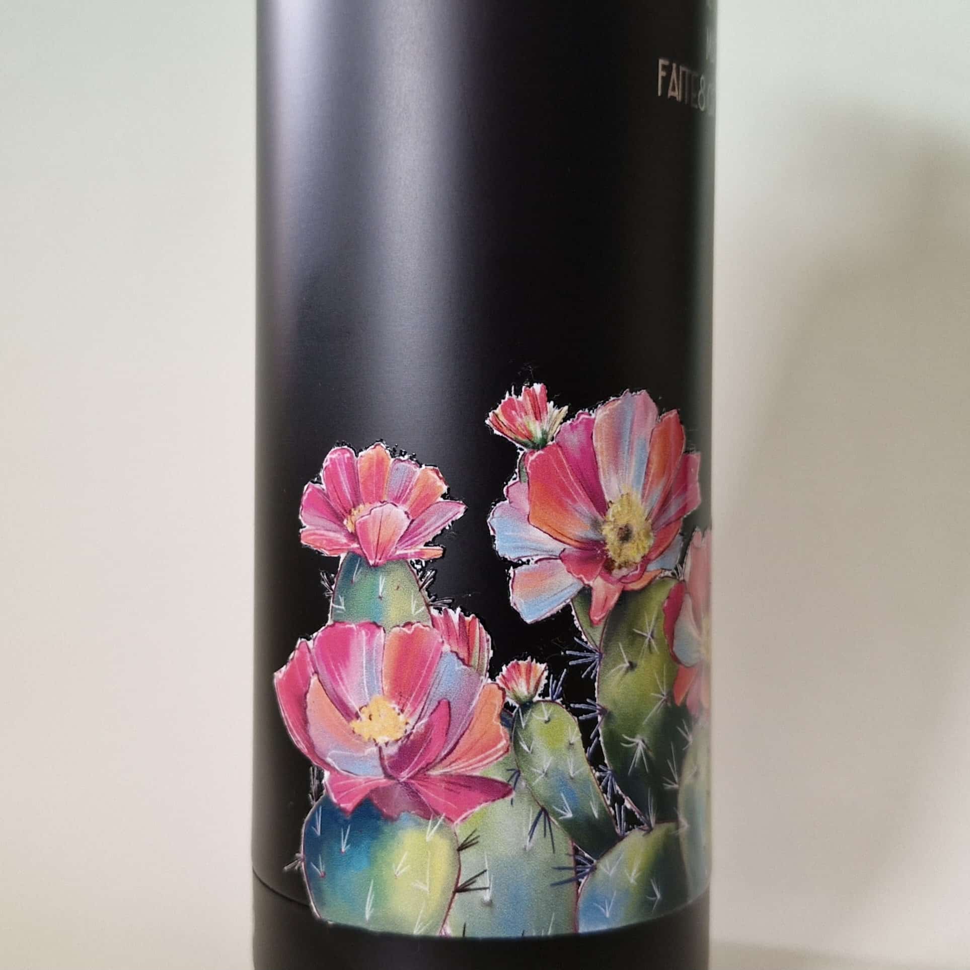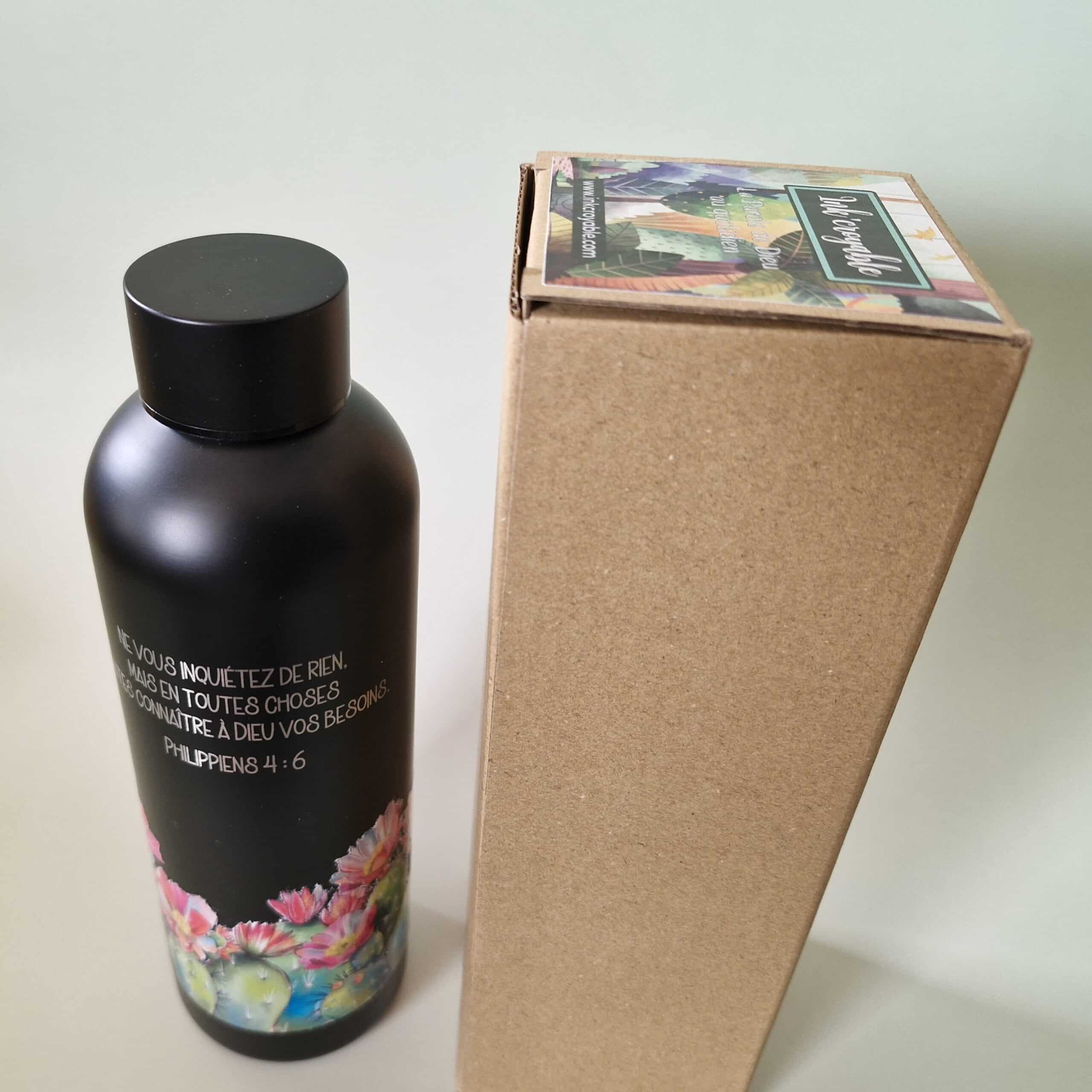 Décor imprimé résiné en relief, cactus et fleurs. Le verset est gravé au laser : « Ne vous inquiétez de rien, mais en toutes choses faites connaitre à Dieu vos besoins. » Philippiens 4 : 6