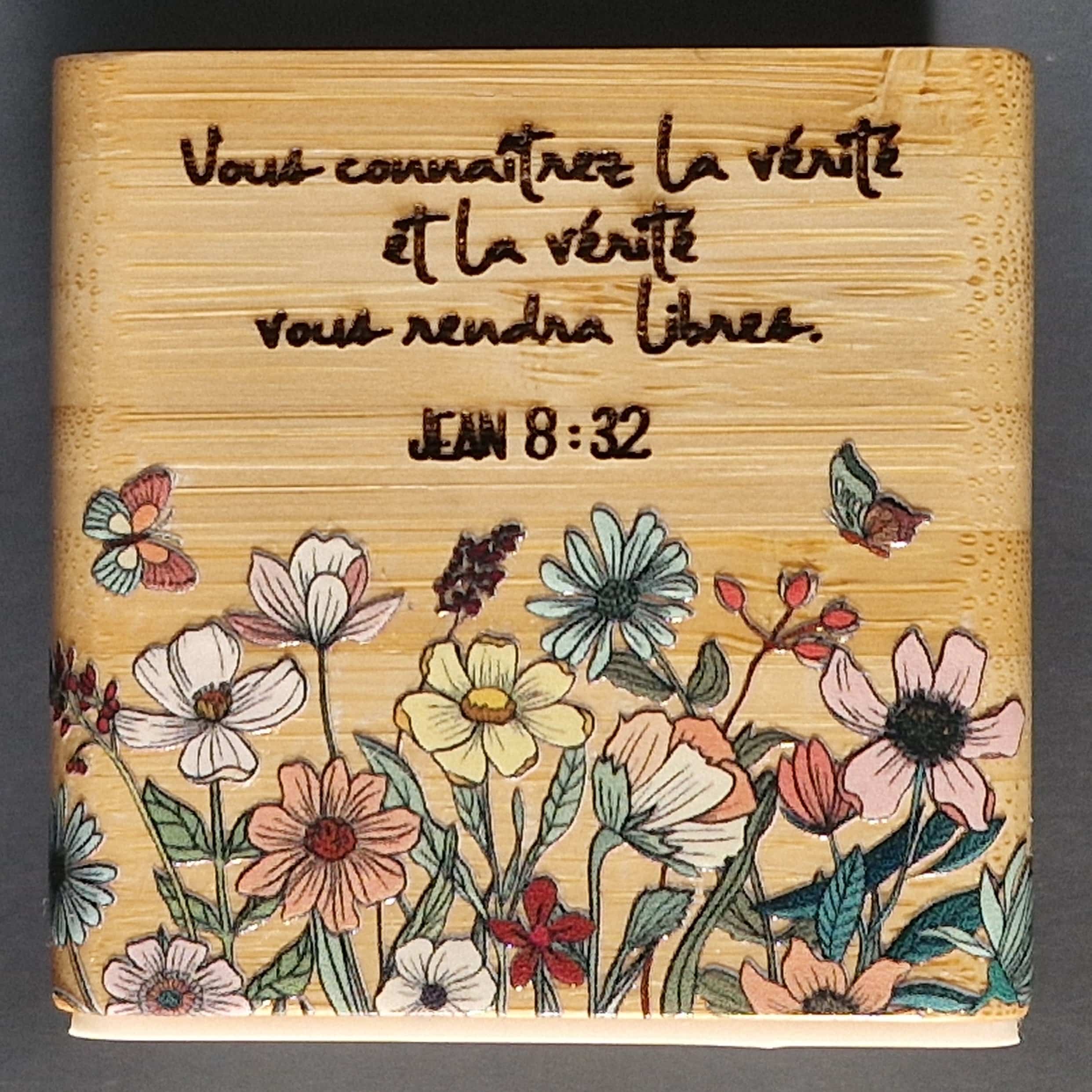 Verset gravé au laser et image fleurs et papillons résinée : « Vous connaîtrez la vérité et la vérité vous rendra libres. » Jean 8 : 32