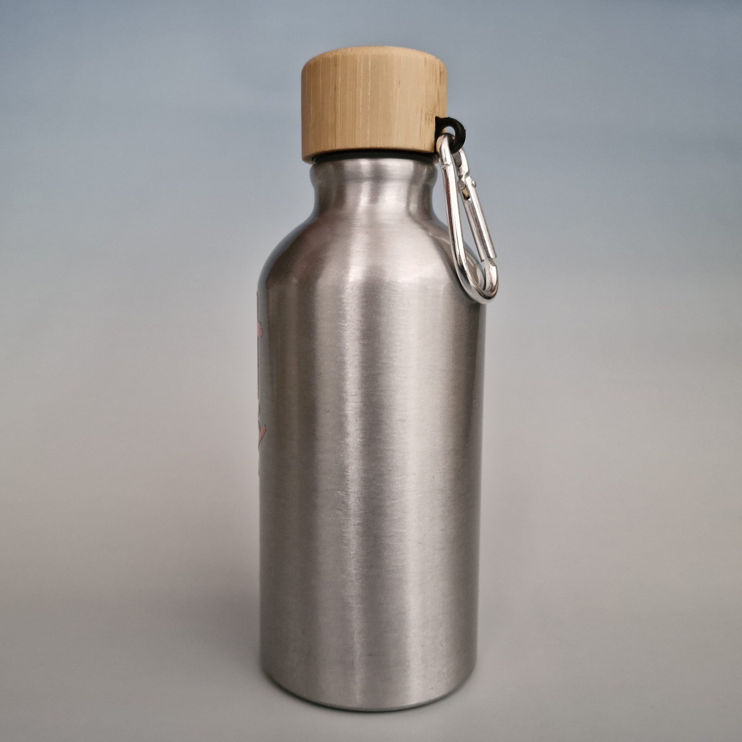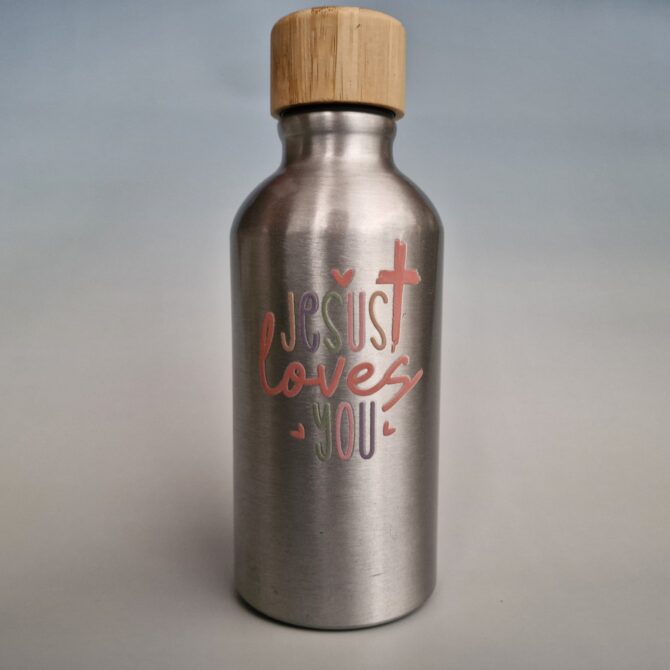 Petite gourde aluminium avec couvercle à vis en bambou et mousqueton, motif imprimé et résiné « Jesus loves you ».