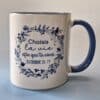 Tasse en céramique brillante, impression recto/verso. L’anse ainsi que l’intérieur de la tasse sont émaillés en bleu.