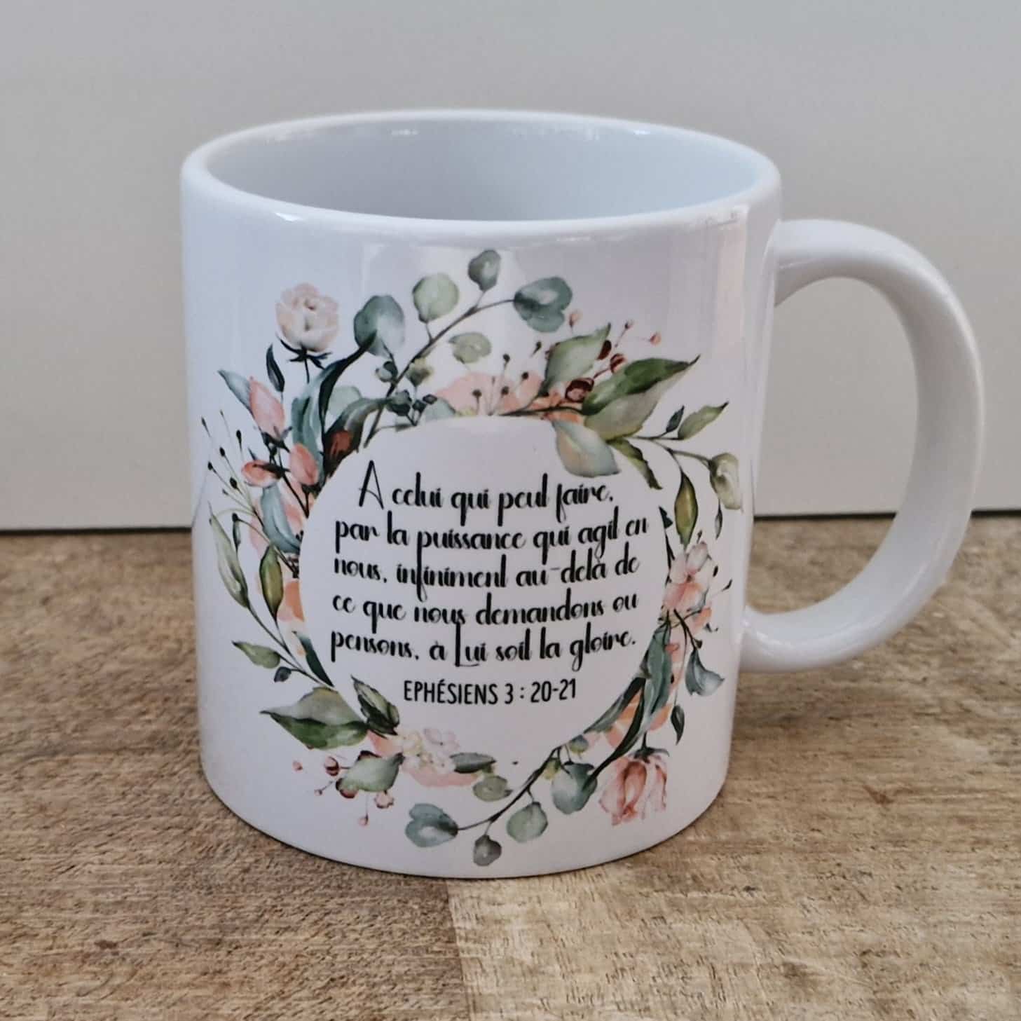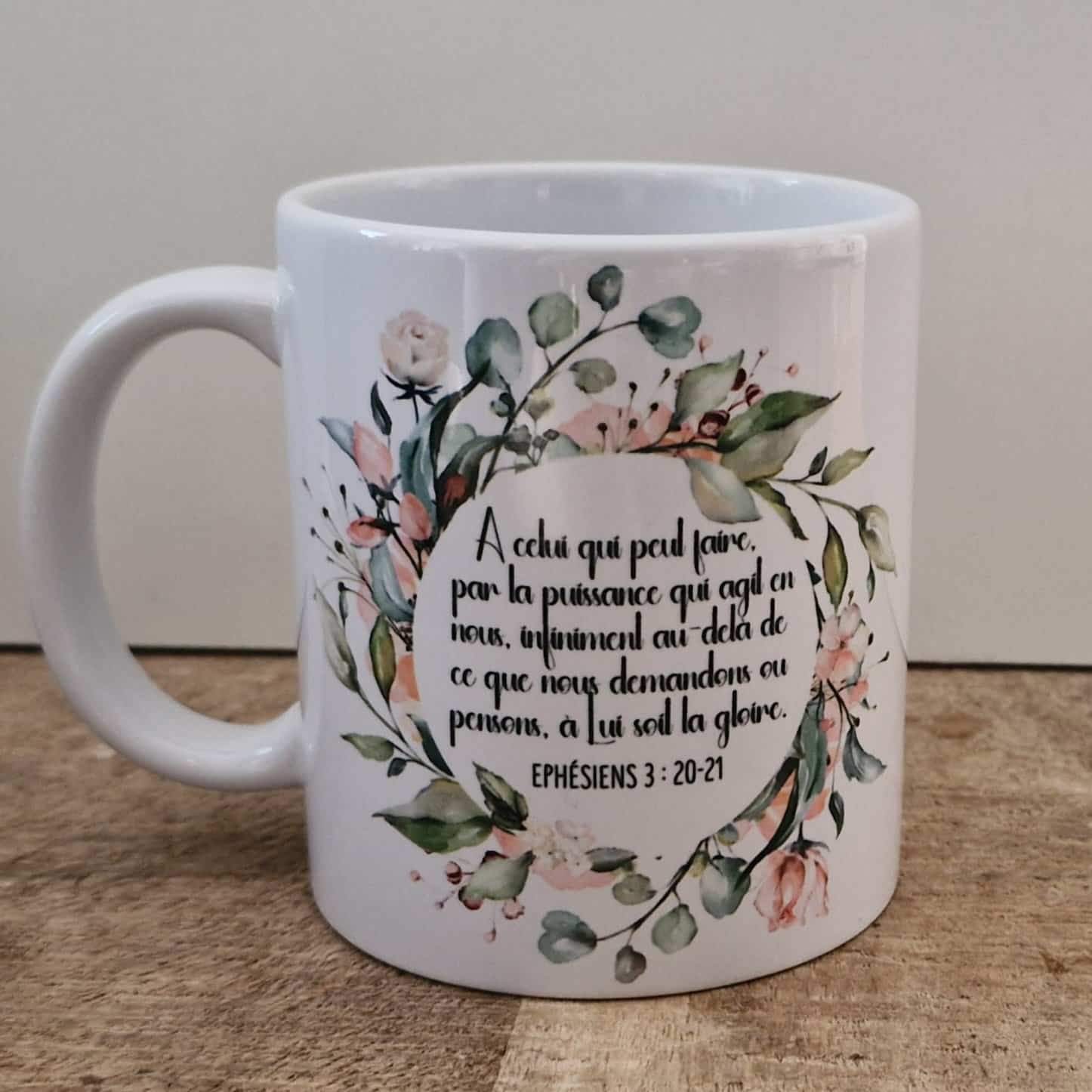 Décor couronnes de fleurs roses, avec le verset : « A celui qui peut faire, par la puissance qui agit en nous, infiniment au-delà de ce que nous demandons ou pensons, à Lui soit la gloire . » Ephésiens 3 : 20-21