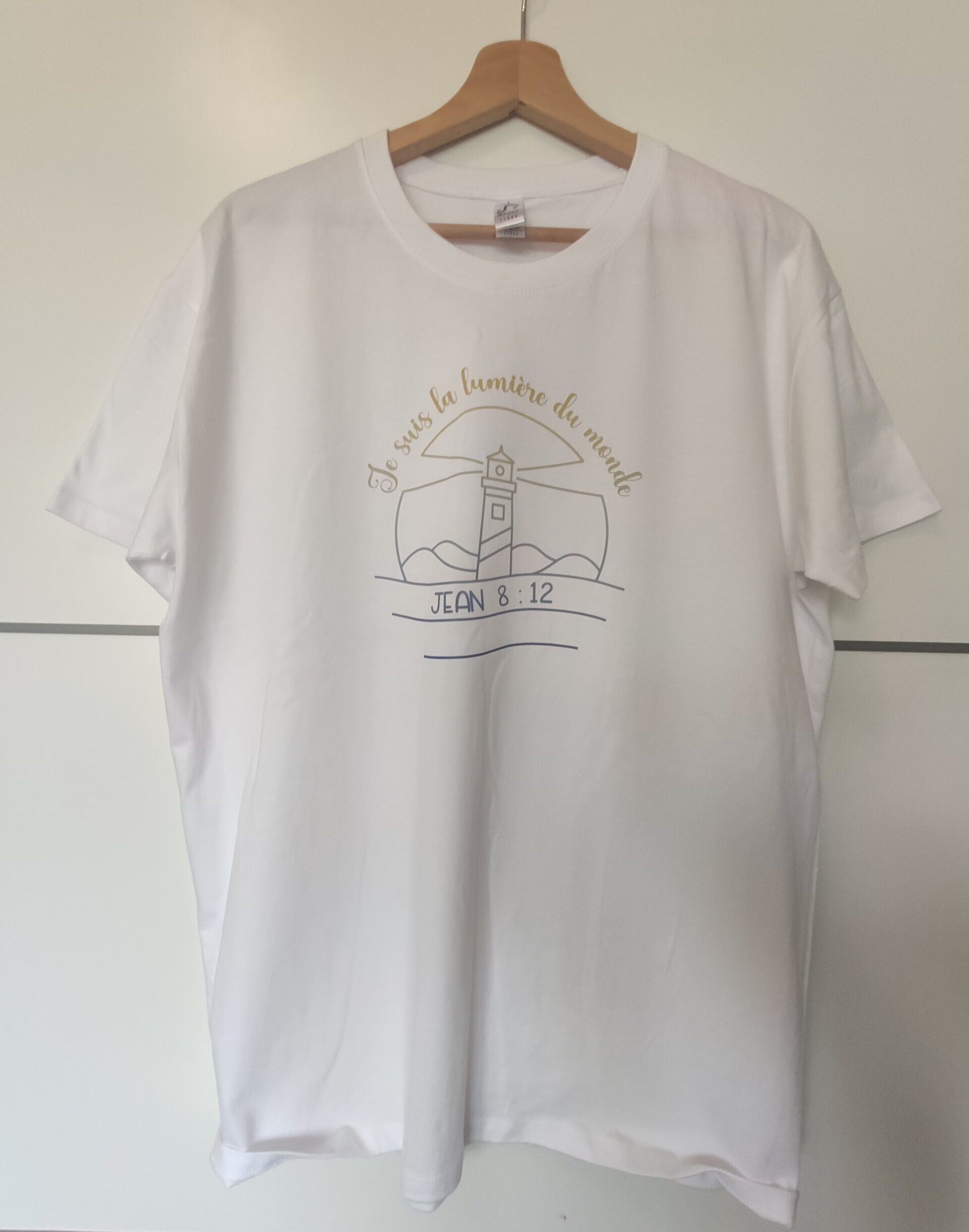 Tee-shirt homme/unisexe coton 190g, motif « lumière du monde » (21×21 cm)